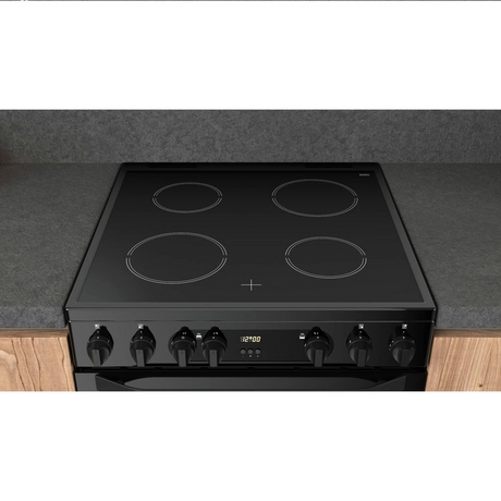 The Hotpoint HDEU67V9C2B 60cm Electric Ceramic Cooker has residual heat indicators so you know when the hob is still hot