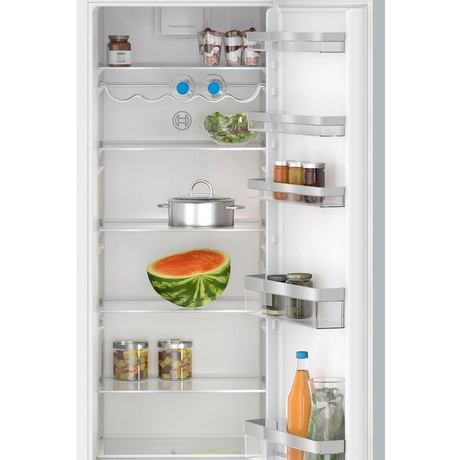 Adding new food to the fridge can raise the internal temperature, which can impact the existing food. With Super Cool, the fridge temperature can be lowered for a short period of time, in preparation for adding new items. If your appliance is paired with the Bosch Home Connect app, you can activate the Super Cool function either by using the app or with voice control.