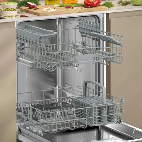 With NEFF’s RackMatic function, you can adjust the height of the top basket in three stages. This makes loading and unloading easier, especially when handling large pots and plates. The baskets can also be moved around to suit the load you’re washing. Plus, this NEFF model also comes with adaptable, foldable elements to make loading and unloading easier.